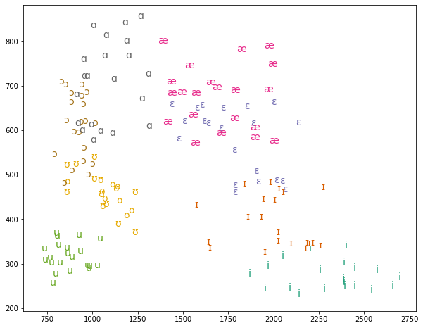 As the outer for loop iterates to the next unique vowel symbol, the color will change as well. When we see this on the plot, each grouping of the same vowel is colored distinctly from the others.