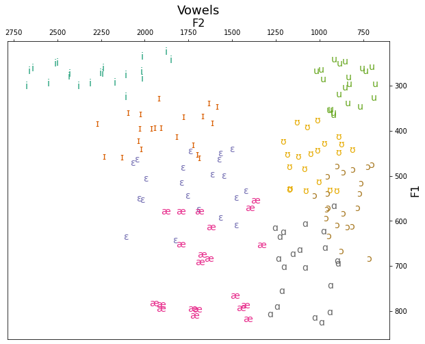 There are multiple ways to plot vowels. The strategy in the code below is to plot every formant value with a blank marker (or symbol), and then to loop through the vowels themselves and annotating the points with the vowel symbols themselves.