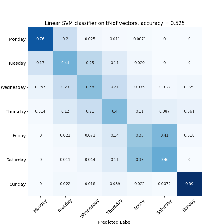 Mondays and Sundays are very easily classified. A perfect classifier would have a solid line of blocks from top-left to bottom-right. This image shows that other days of the week, while less accurately classified, are often confused for adjacent days of the week. This is likely because those puzzles are quite similar to the adjacent days. (For example, Friday and Saturday look to be very similar.) Even though the overall accuracy hovers around 50%, choosing a day simply by chance would give around a 14% accuracy (1 over 7).